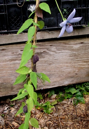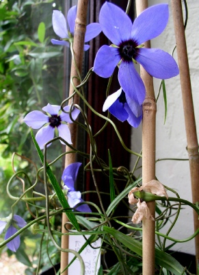 Superficially similar to C.obtusa but always flowers later, usually mid to late June, is quite vigorous reaching 4′ and stronger blue flowers lined with pale purple on the outside and stained deep purple inside with a deep green and white base. The leaves have pale edges. We grow our plant on an East facing trellis in quite poor but well drained soil.
