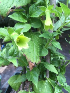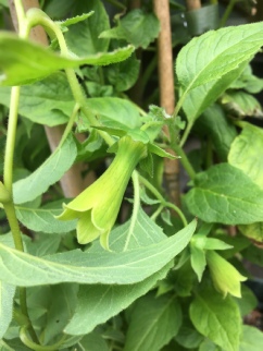 A fairly new one to us but it’s bulking up promisingly. There are two variants as far as we are aware but they are dealt with separately but all three are worth growing. This twining climber has beautiful straight sided bells in yellowish green with maroon staining on the outside and dark maroon speckles internally. The calyx and bud are also quite distinctive with fine lines in maroon radiating out from the stem.
