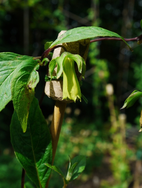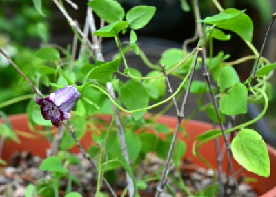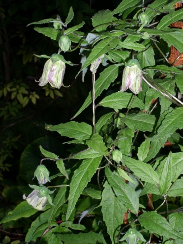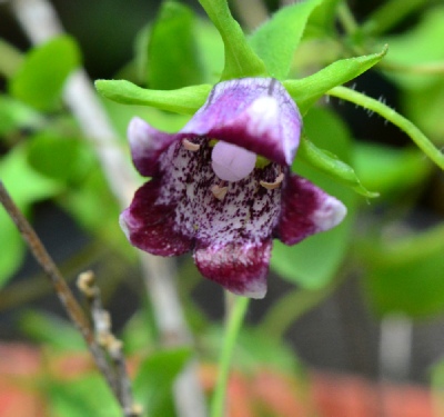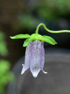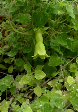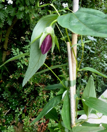 The flower shape of this delightful little twining climber is like no other in the genus that we are aware of. The yellowish green tubular flowers hang amongst small hairy leaves on pinkish stems. This can be quite vigorous with a mass of flowers in mid summer and in other years hardly puts in an appearance at all. In 2014 our garden plant began flowering in October right up until Christmas! In 2015 it was back to its best. We find that in wet summers slugs are a real problem with this species so one must be vigilant.
