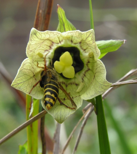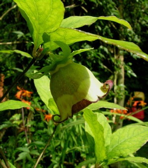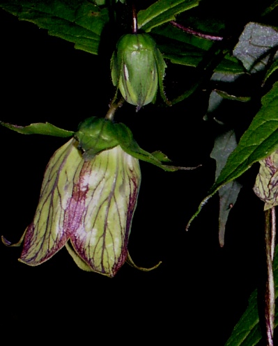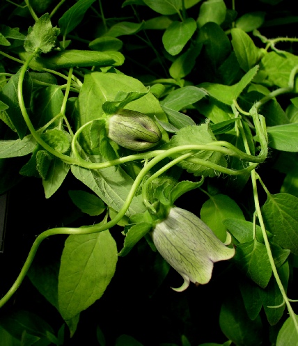 A large, vigorous twining climber not often seen, seed lists usually proving to be Cc rotundifolia var. angustifolia or pilosula. This is surprising since C.tangshen is the only member of the genus, at least as far as we are aware, with an inferior calyx i.e. the calyx lobes completely enclose the calyx when the flower opens. The large flowers are greenish throughout with internal markings and the seeds are large and brown . C.tangshen will hybridise with others and we have grown a rather attractive hybrid in the past (see photo below).