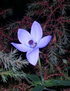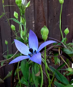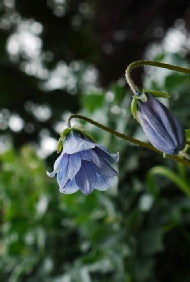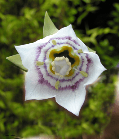 The most frequently encountered member of the genus and an easy garden plant with pale blue campanulate bells with fine darker blue lines on the outside and two purple concentric rings on the inside and orange and black at the base.