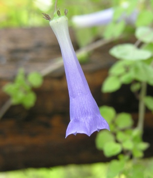 Translates as graceful slim bells which sums up this small twining climber perfectly. Lovely slightly flared violet blue tubular flowers fading to white at the tips hang from a lime green calyx amongst tiny bright green leaves with dark outer edges. This species appears to be slightly tender and rather short lived unfortunately although it will self sow but it’s best to collect seed and sow each year to ensure a succession of plants. The slightly foxy smell associated with the genus is at its most pungent with this one! Instead of a tuber there are fleshy roots which can be used for root cuttings.