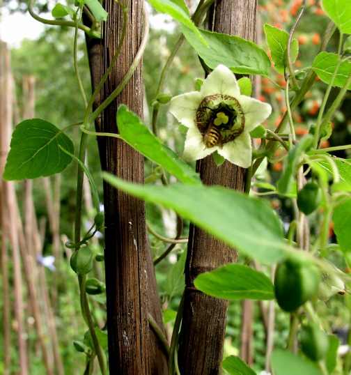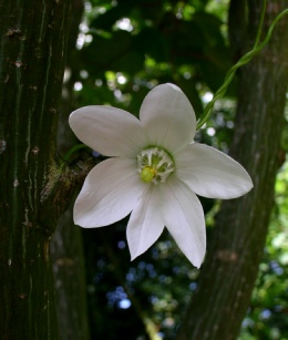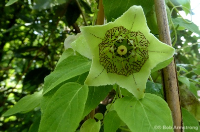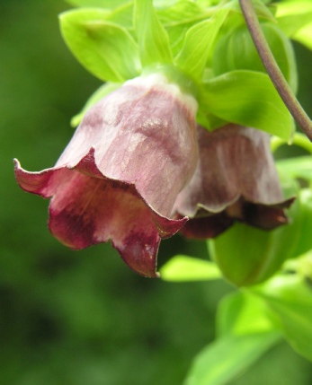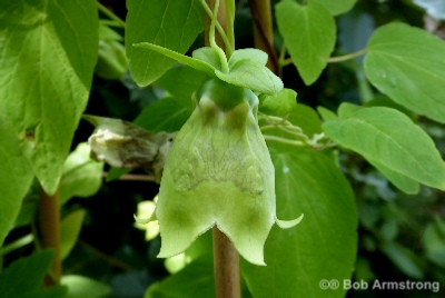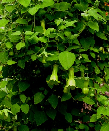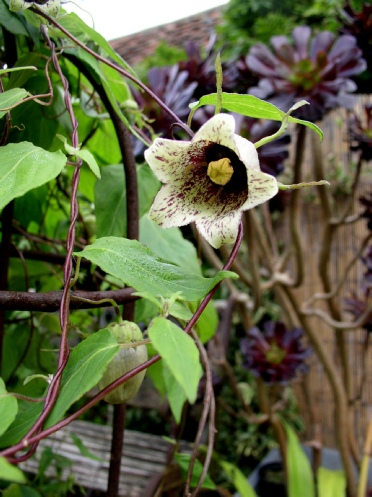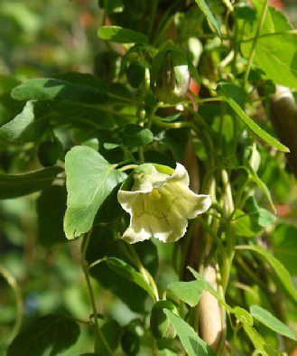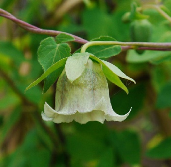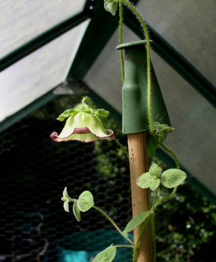A large vigorous twining climber with large shallowly toothed leaves with prominent veins on the underside. The typical campanulate bell is quite variable with green/slatey blue on the outside and blotched and spotted with maroon on the inside, but sometimes hardly at all. It is worth seeking out a good form. It seems to flower better in a well lit situation and will self seed if happy.