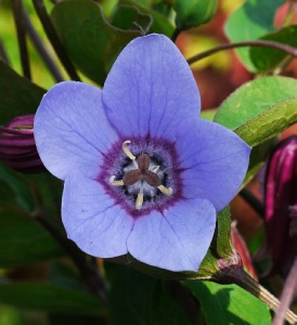 Another twining climber of the Pseudocodonopsis group with large open blue flowers, slightly paler than P.vinciflorus, with a dark “eye”.Pseudocodon forrestii flowers later than both Pp vinciflorus and grey-wilsonii and in some years is the last to flower for us. The leaves are less toothed than P.vinciflorus and the calyx lobes fully clasp the bud. It can be quite vigorous reaching 2 metres or more and makes a grand spectacle in late summer.