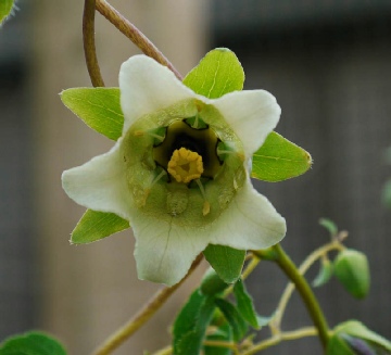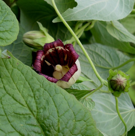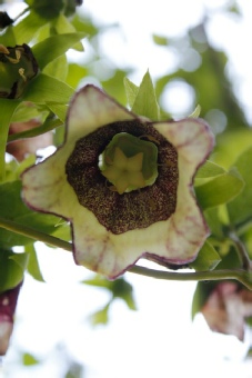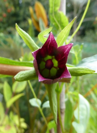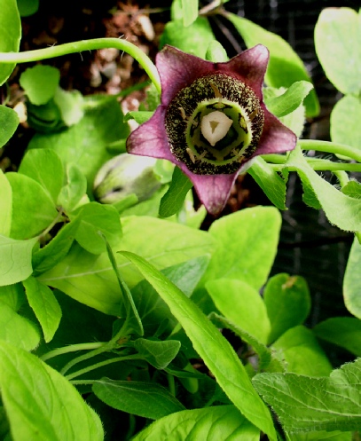 A lovely end of summer twining climber with a greenish corolla with intricate dark red markings internally. The tips of the petals are strongly recurved and the distinctive calyx resembles an acorn cup in shape. The stems are dark red and the leaves large. The only downside is that this one is slightly tender so best grown either under glass or in a large pot (the tuber gets very large).
