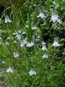 Standing at approximately 18″ this is one of our favourites with distinct lantern shaped light blue flowers with darker blue veins inside and out turning to dark purple towards the base. The bud is long and purplish blue. On a mature specimen the flowers are numerous with as many as 50 on our oldest plant. One year the earliest flowers all opened as doubles and the later ones singles. We believe a late frost caused a type of fasciation that year. Whatever, it was very beautiful!