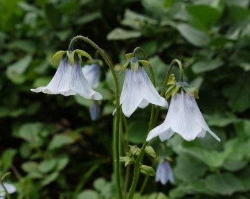 The flowers are bell shaped of the palest blue with pale purple on the inside and a green base. The corolla is slightly wider than deep with quite recurved petals. As the flowers age they gradually increase in size. The whole plant reaches about 2′ and as much again across.