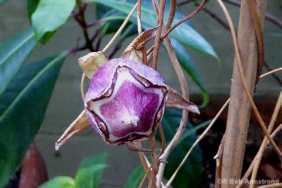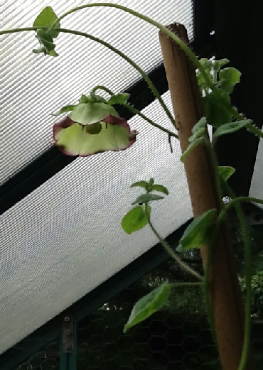 A delightful twining climber that flowered for the first time for us in 2014. All the stems and foliage are covered in fine hairs giving the plant a silvery appearance. It is rather late to surface before climbing to 5 feet or so, flowering in late summer. The leaves are small and heart shaped and the flower wider than deep with very recurved petals. The colour is pale green with the recurved tips in dark pink.
