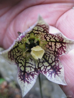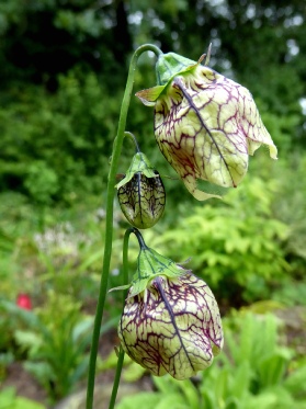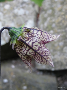 Another of the “had it once but lost it brigade” this gorgeous little non-climber resembles a Fritillary more than a Codonopsis in flower. Its closest relative in the genus is C.meleagris (no coincidence that a common Fritillary is also called meleagris). Both have a basal rosette of leaves, quite distinctive even in very small plants, from which rise stems with striking pale greenish-yellow flowers lined and spotted with chocolate brown and purple in the case of C.subscaposa.