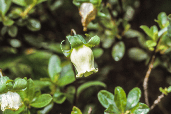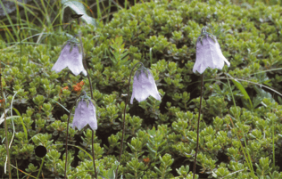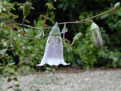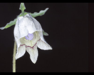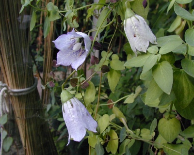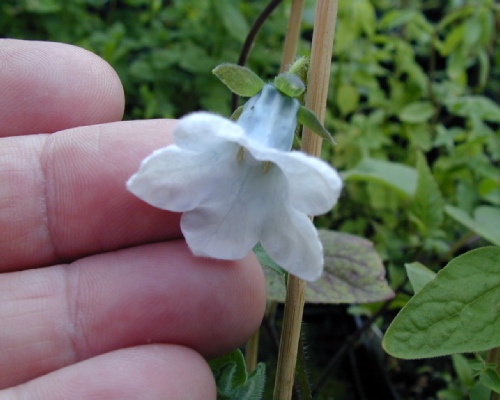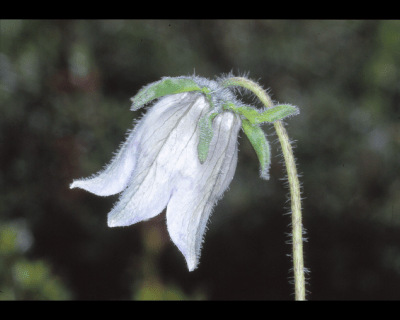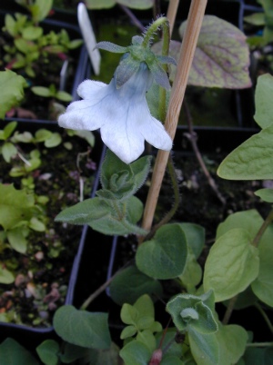 Growing on grassy slopes at an altitude of 3000 to 4000 metres in N. W. Sichuan and East Tibet this seemingly delicate alpine plant thrives in very harsh conditions. Here it is growing in a Suffolk garden! This is one of the very few white flowered Codonopsis. The leaves are covered in white hairs making it very distinctive.